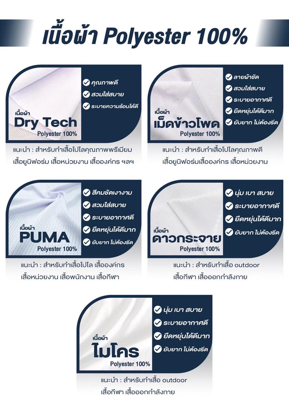 เนื้อผ้า Polyester 100% พรีเมียม มีเนื้อผ้าให้เลือกหลายหลาย แตกต่างตามวัตถุประสงค์ไปใช้งาน